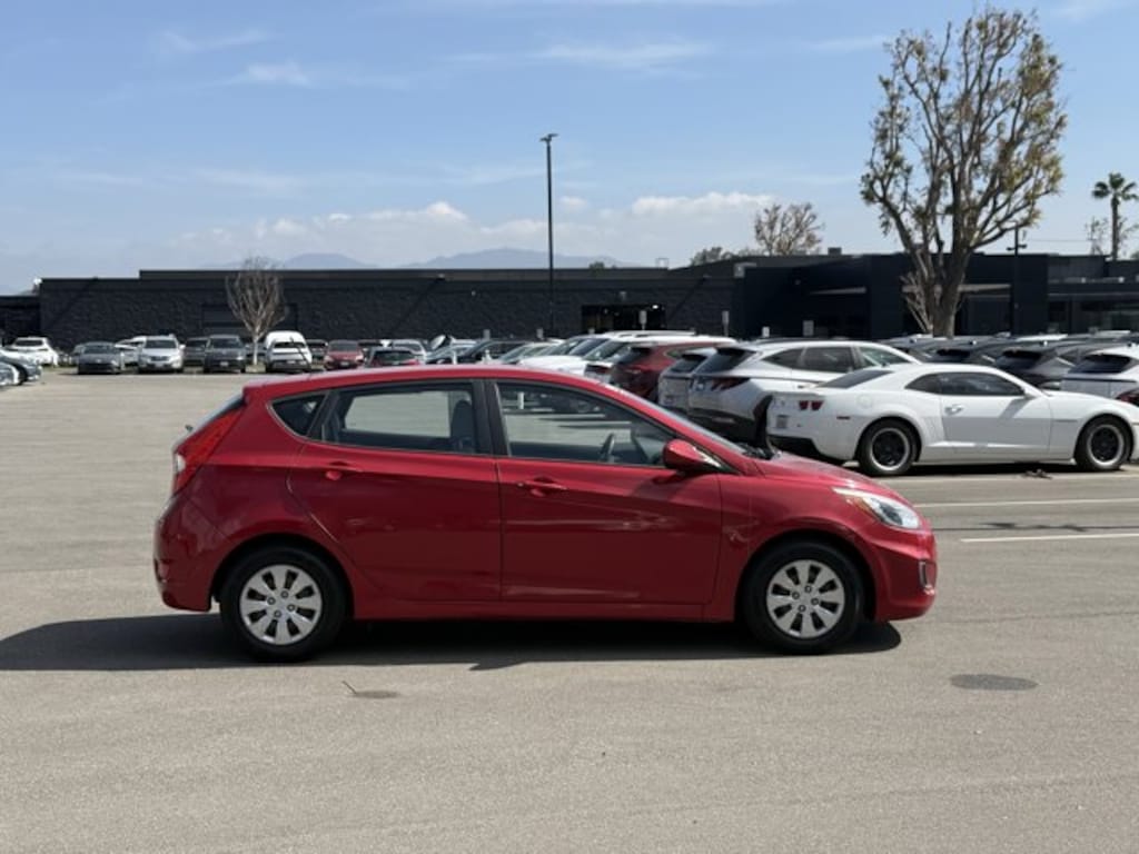 This 2015 Hyundai Accent GS is offered to you for sale by AutoNation Hyundai Valencia. This vehicle was engineered to be both economically and environmentally friendly with exceptional fuel efficiency. This low mileage Hyundai Accent has barely been touched. It's the next best thing to buying new. Beautiful color combination with Boston Red Metallic exterior over Black interior making this the one to own! More information about the 2015 Hyundai Accent: The Hyundai Accent is a subcompact available as either a sedan or a hatchback. Well-equipped in standard form, the Accent features an impressive 92.2 total cubic feet of passenger room, defying the myth of the small car's cramped cabin. Fuel economy is also impressive, averaging 28 mpg in the city and 37 mpg on the highway, thanks in part to special low rolling resistance tires. Interesting features of this model are impressive interior passenger room, available as a hatchback or sedan, Affordability, strong standard feature list, and hybrid-like mileage